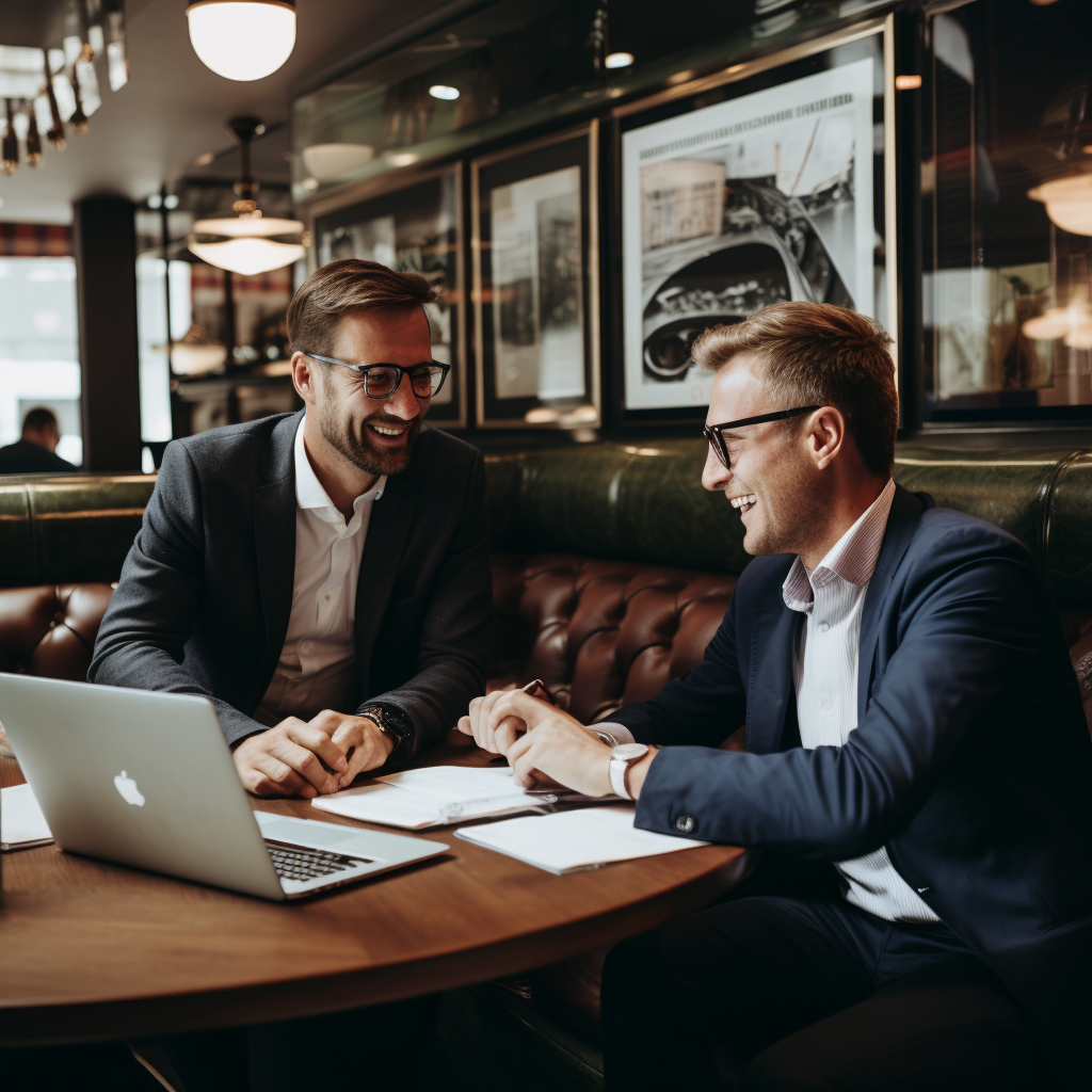 Two businessmen in suits and glasses sitting at a restaurant table, smiling and laughing during a meeting with documents and a laptop.